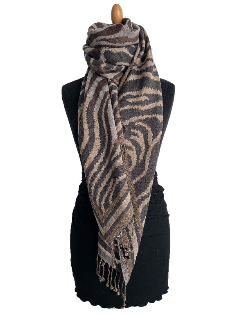HIGHFIELD SHAWL GEWEVEN FANCY ZEBRA DESSIN 70CM X 180CM. ANTRACITE/ZAND/COGNAC
