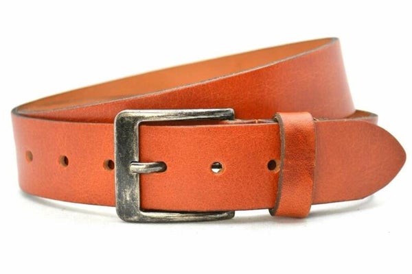 Deze 4 cm brede jeansriem is op traditionele wijze vervaardigd uit volnerf leer.